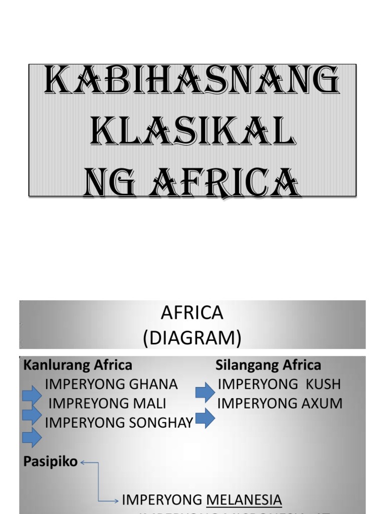 Ang kabihasnang africa ay. Dito nakilala ang ibat ibang kabihasnang umusbong na nagbigay ng mga kani-kanyang ambag sa pag-unlad ng kabihasnan. Sa kanluraning parte naman ay makikita ang mga umusbong na sibilisasyon tulad ng Mali Ghana at Songhai. UNANG DAKILANG IMPERYO SA KANLURANG AFRICA MATATAGPUAN ANG SENTRO NITO SA REHIYONG TINATAWAG NA SUDAN.
